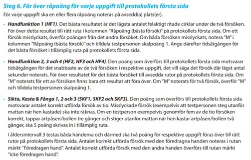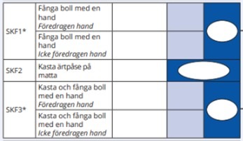 För detta åldersintervall testas båda händerna i SKF1 och SKF3, och två poäng förs över till protokollets första sida. Här ska ”Bästa hand” ändras till ”Föredragen hand” och ”Andra hand” ändras till ”Icke föredragen hand”.